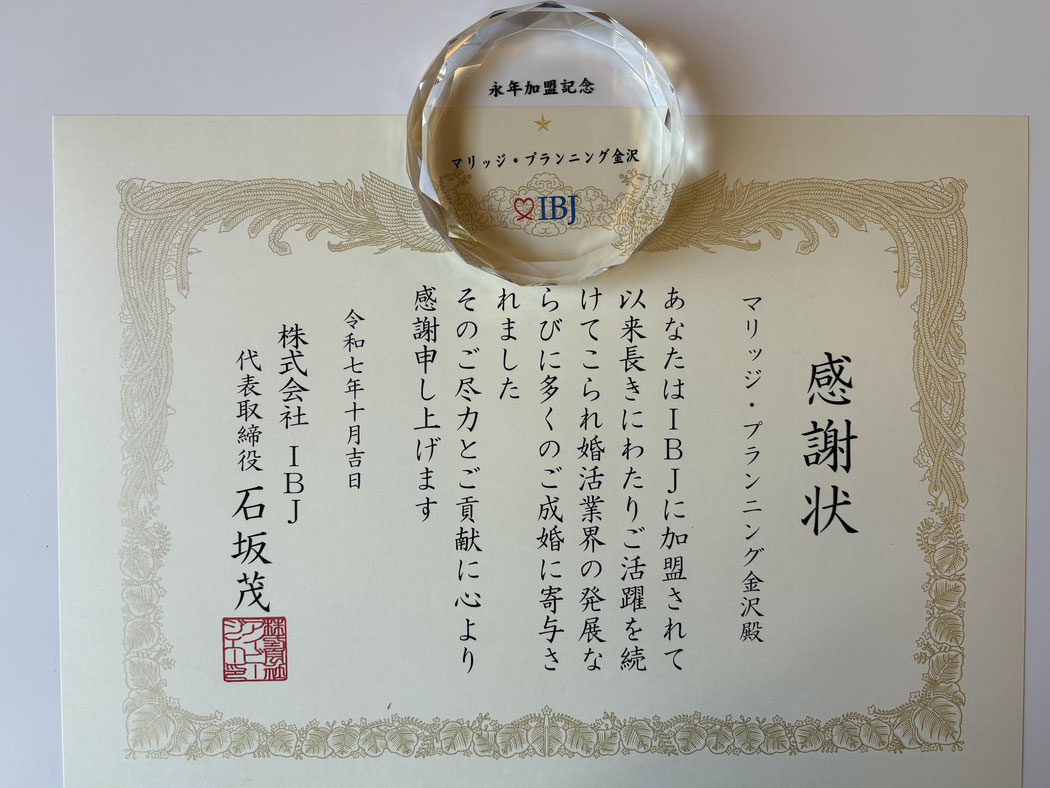 ニュース IBJ様より「永年加盟記念感謝状」をいただきました IBJ様より「永年加盟記念」をいただきました。 これまで出会ってくださったたくさんの会員様、支えてくださった関係者の皆さまに心より感謝いたします。 婚活はときに悩みや迷いもありますがその一歩一歩が“ご縁”へとつながります。 これからも一人ひとりの想いに寄り添いながら「出会えて良かった」と思えるご縁をつなげていきます。 記念プレートを眺めながら、これまでの出会いを思い出しています。 tagPlaceholderカテゴリ: